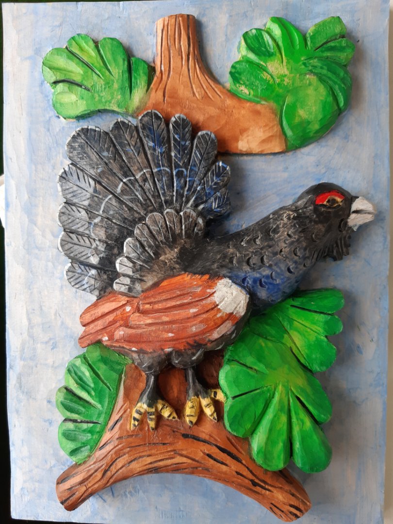 Hallo Schnitzfreunde, ich habe schon besseres abgeliefert.Die lange Pause macht sich doch bemerkbar..Den Hintergrund habe ich ,wie man sieht, mit einem hellen blau bemalt. Der Vogel ist nun gewachst und auf Glanz gebürstet.