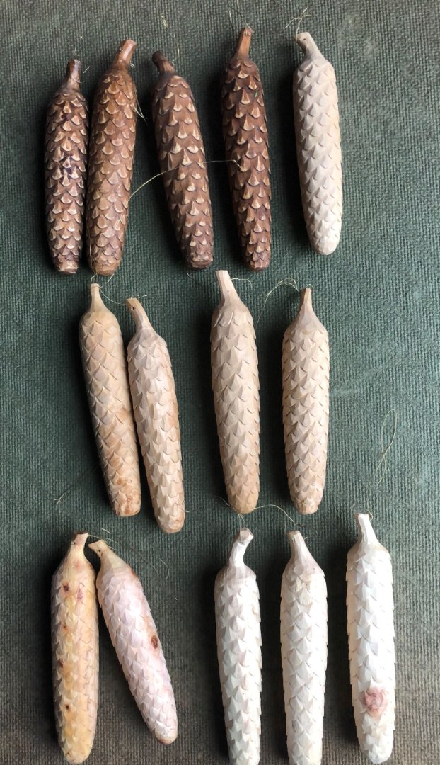Hier nun meine fertig geschnitzten Tannenzapfen.