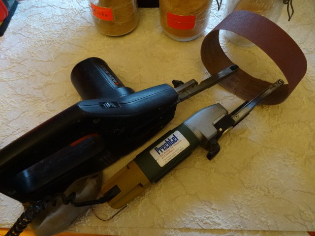 So habe ich z. B. zwei Schleifmaschinen - siehe Bild - dafür kaufe ich billig die breiten Bänder und schneide sie schmal . Hierfür ist das Anreißholz mit dem eingebauten Bleistift gedacht , so schneide ich mir " am Strich entlang "