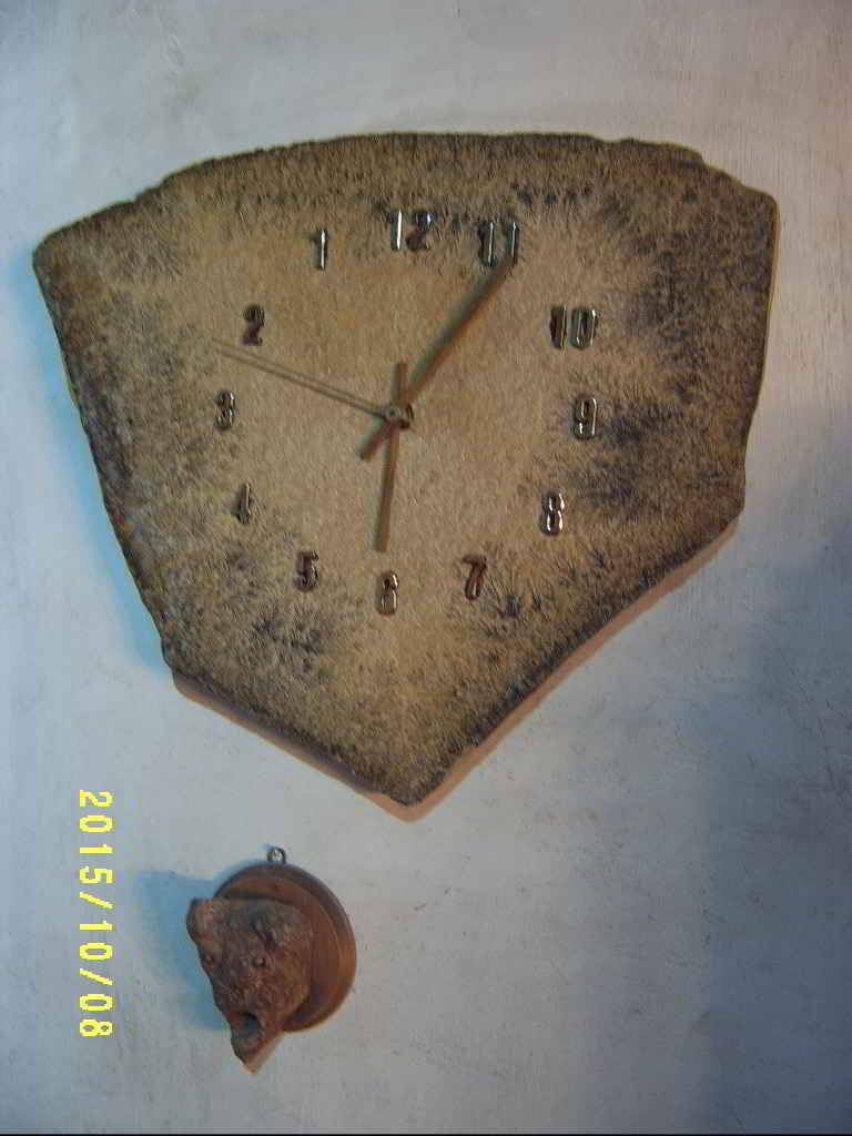 bittesehr, die Uhr die anders läuft ,einfach rückwärts. Die Platte ist aus dem bekannten Steinbruch,( bei Eichstätt) in dem auch der weltbekannte Urvogel " Archäopteryx " gefunden wurde ; aus der selben Lage stammt diese , über 150 mill. Jahre alte Platte . Es war ein Kegelfels , von dem die Platten vorsichtig abgehämmert werden ; man sieht das an den Einschlüssen ringsherum.