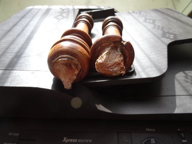 Neu drechseln wäre für mich zu schwer gewesen , da ich keine Kopiereinrichtung an meiner Drechselmaschine habe , also war eine Reparatur angesagt . Nur verleimen , wäre zu wenig Stablität für dieses obere Querteil der Stuhllehne gewesen : also verleimen mit innerlicher Verstärkung , durch einen 8 mm Rundstab war notwendig .