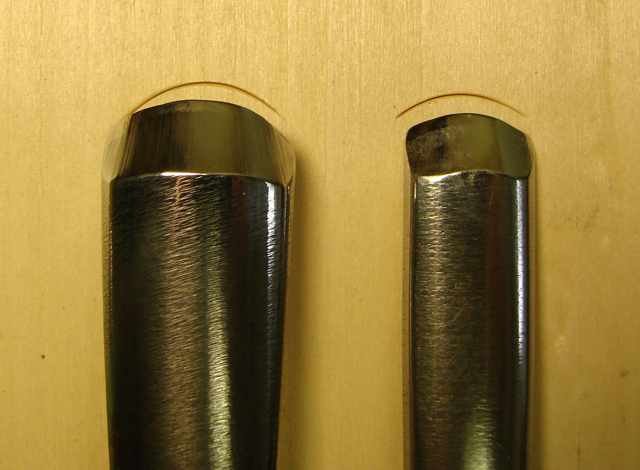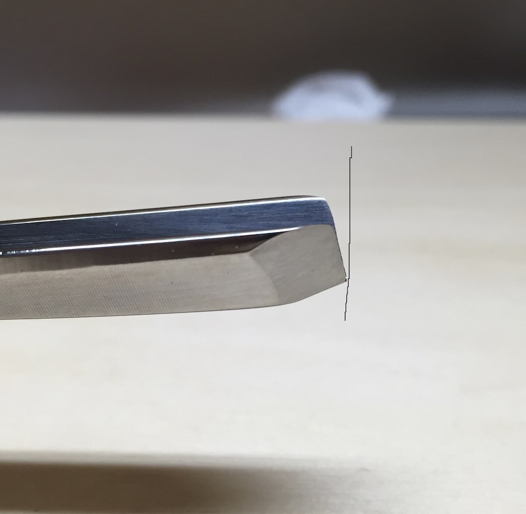 Wie ihr wisst, wenden alle Hersteller eigne Verfahren zu Herstellung der Werkzeuge an. Es genügt also erst mal ein prüfender Blick auf die Schneide eures Werkzeuges, bevor man überhaupt mit dem Schleifen beginnt. Zur Anschauung habe ich mal einen Geißfuß der Marke Pfeil verwendet.