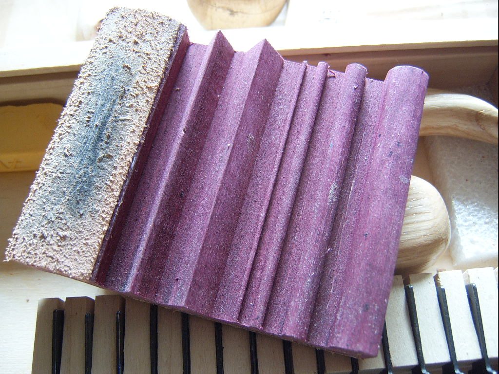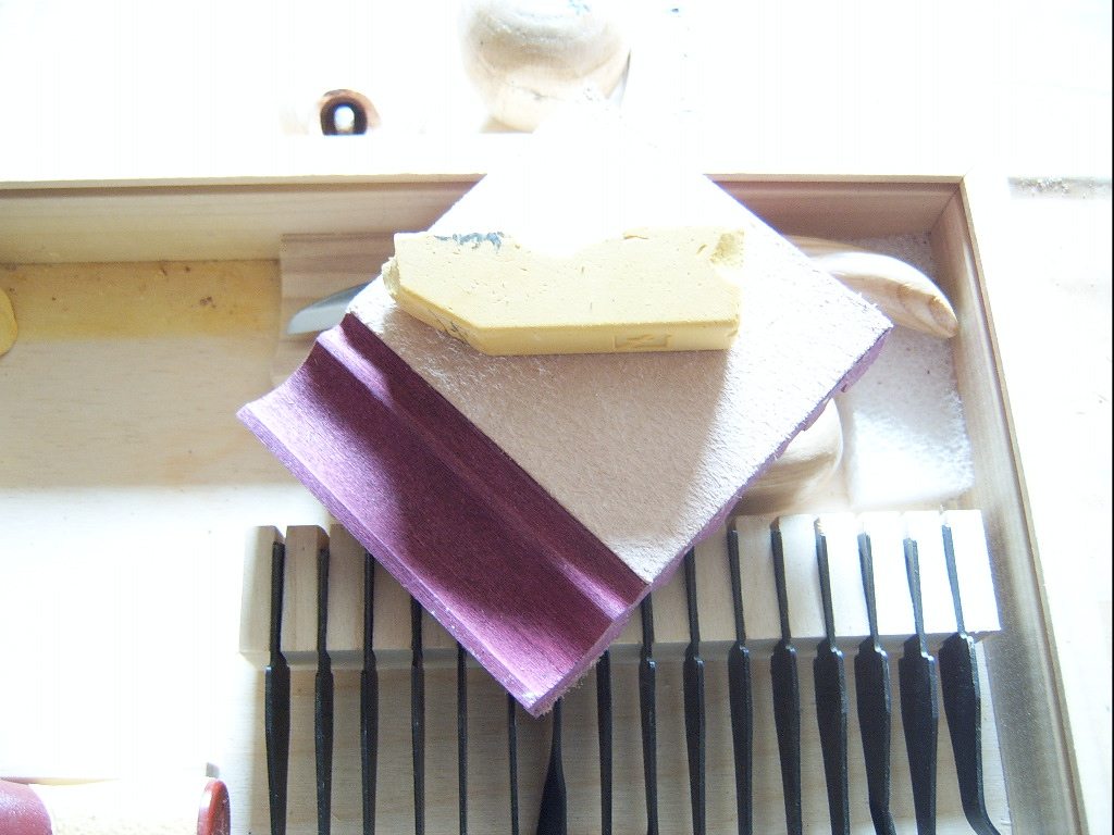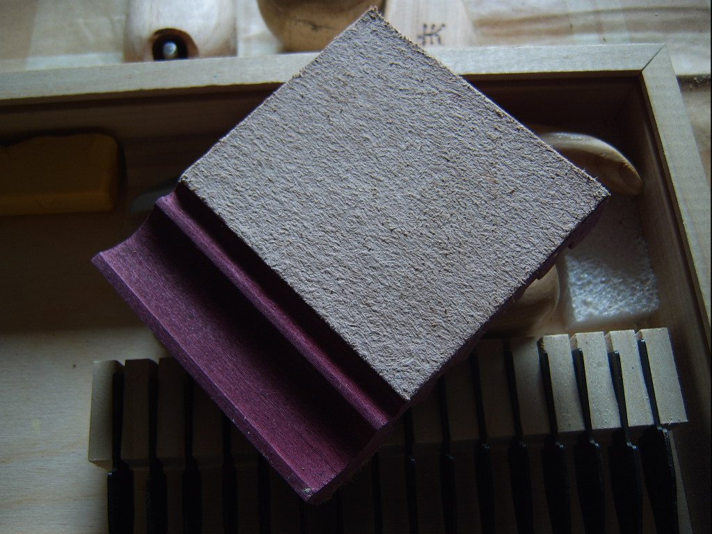 Die hochstehenden Profile der FLEXCUT- Abziehklötze benutze ich gerne um eine kleine Innenfase in meine Eisen zu ziehen. Das Holz habe ich mit Chromputz-Paste bestrichen. Die trocknet zwar gleich, aber mit einem leicht öligen Lappen wirds dann auch gut.