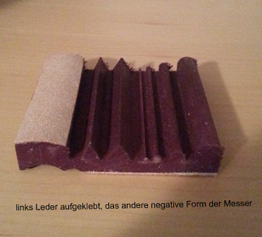 Die Holzprofile haben mich von der Idee her begeistert. Allerdings war mir die Länge von ca 10cm zum Abziehen von Hohleisen zu Kurz. Darum habe ich mir diverse Hohlleisten unterschiedlicher Radien gekauft und jeweils 30cm lang abgesägt und mit weichem Leder beklebt und mit Polierpaste bestrichen. Je länger der Abziehweg umso weniger Striche muß man führen. Auf diesen Leisten ziehe ich unterschiedliche Stiche, die sich in die Leiste schmiegen, ab.