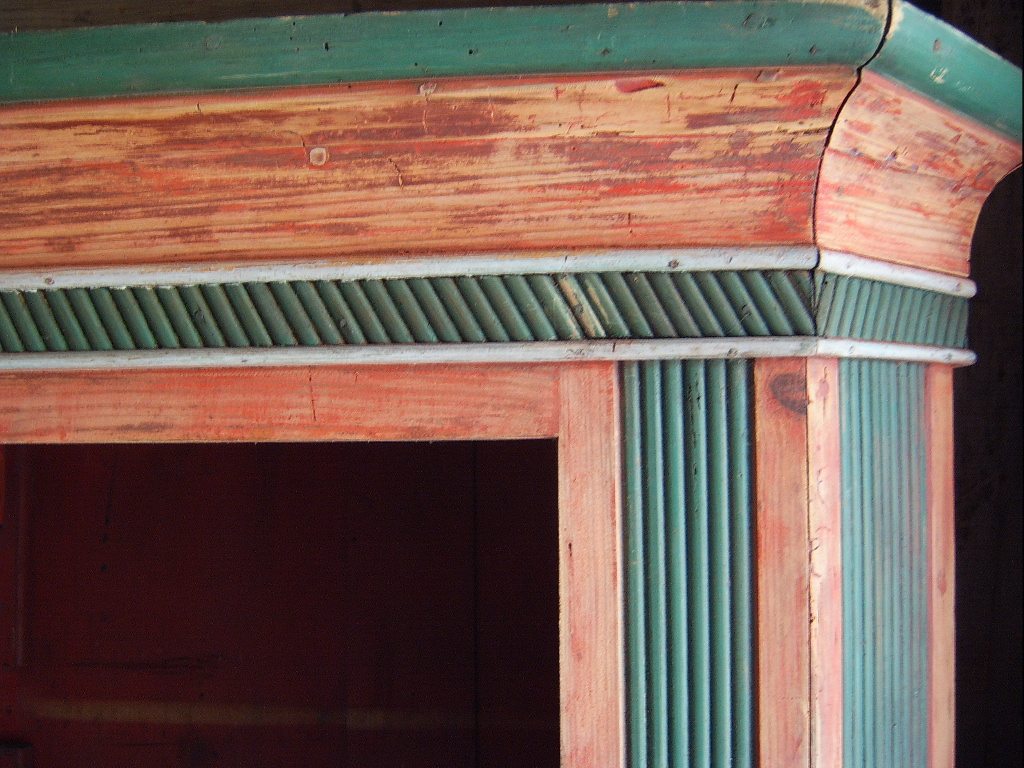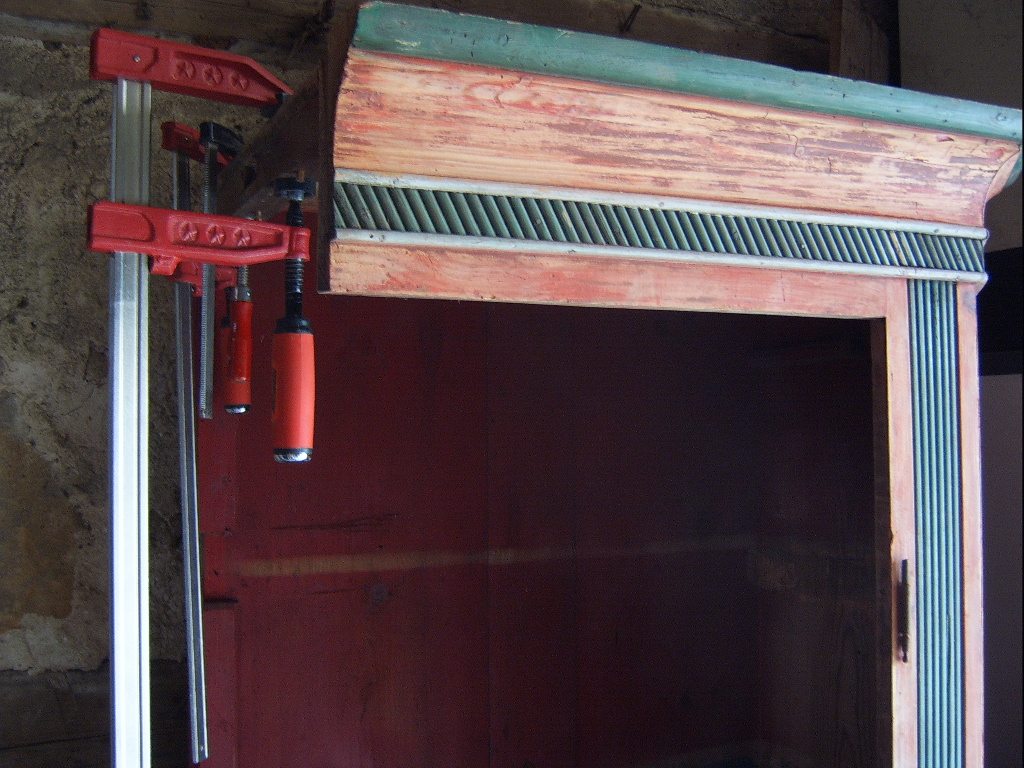 Der alte Bauernschrank - ich habe ihn bereits vorbehandelt - wird erst mal etwas mit eingefärbten Holzkitt bearbeitet , dann kann ich ihn nur im selben Farbton , lasierend auffrischen . Eine totale Entfärbung ist hier nicht möglich , wenn der Schrank nicht beschädigt werden soll . Ich habe ihn mal vor ca 40 Jahren bekommen und er steht bei mir seit 30 Jahren nur herum , da er bedingt durch mein Innenfachwerk und den kleinen Räumen nirgends