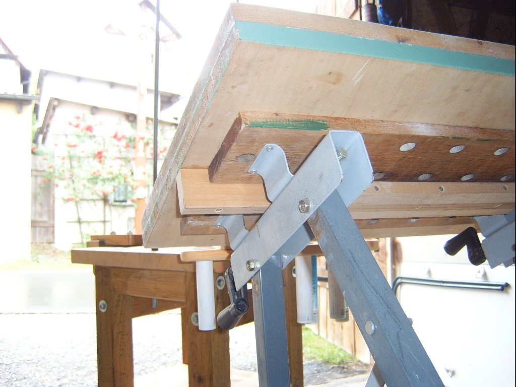 Zusätzlich zeige ich euch noch die sehr einfache Möglichkeit - ein Brett mit Klemmvorrichtung , das ich in so einen einfachen Baumarkttisch einklemmen kann .