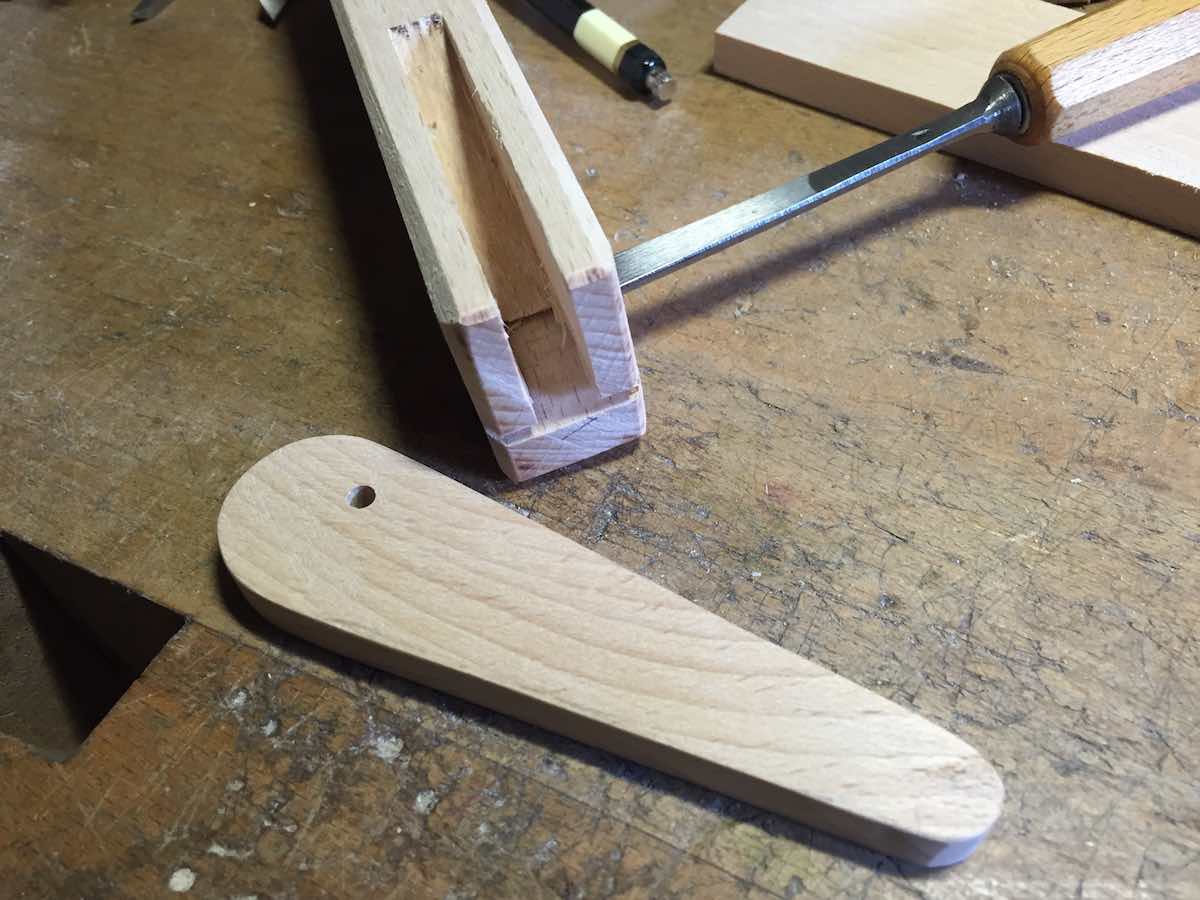 Der Spannhebel besitzt in seiner Bohrung noch eine Messingbuchse, die verhindert, das sich die Spannfederhülse durch seinen Form ins Holz einarbeitet.