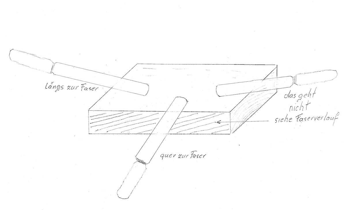 Will man ein Brett mit einem größere Hohleisen beschnitzen, geht das oftmals nur in eine Richtung, da das Holz entweder kleine Verwachsungen aufweist oder nicht 100% zum Verlauf der Faser geschnitten wurde, was natürlich auch zu Ausbrüchen führen kann. Oftmals kann man diesen Effekt auch erleben, wenn man versucht ein Brett auf der Schnittkante plan zu hobeln, dies geht dann auch nur in eine Richtung. Hiebei gibt es jedoch eine Ausnahme. Spaltet man das Holz zuvor lässt es sich auch in beide Richtungen schnitzen.