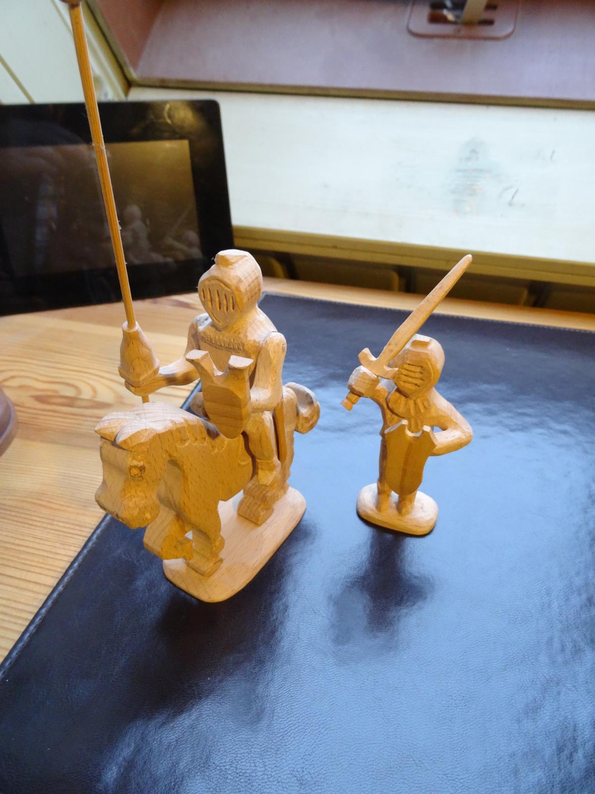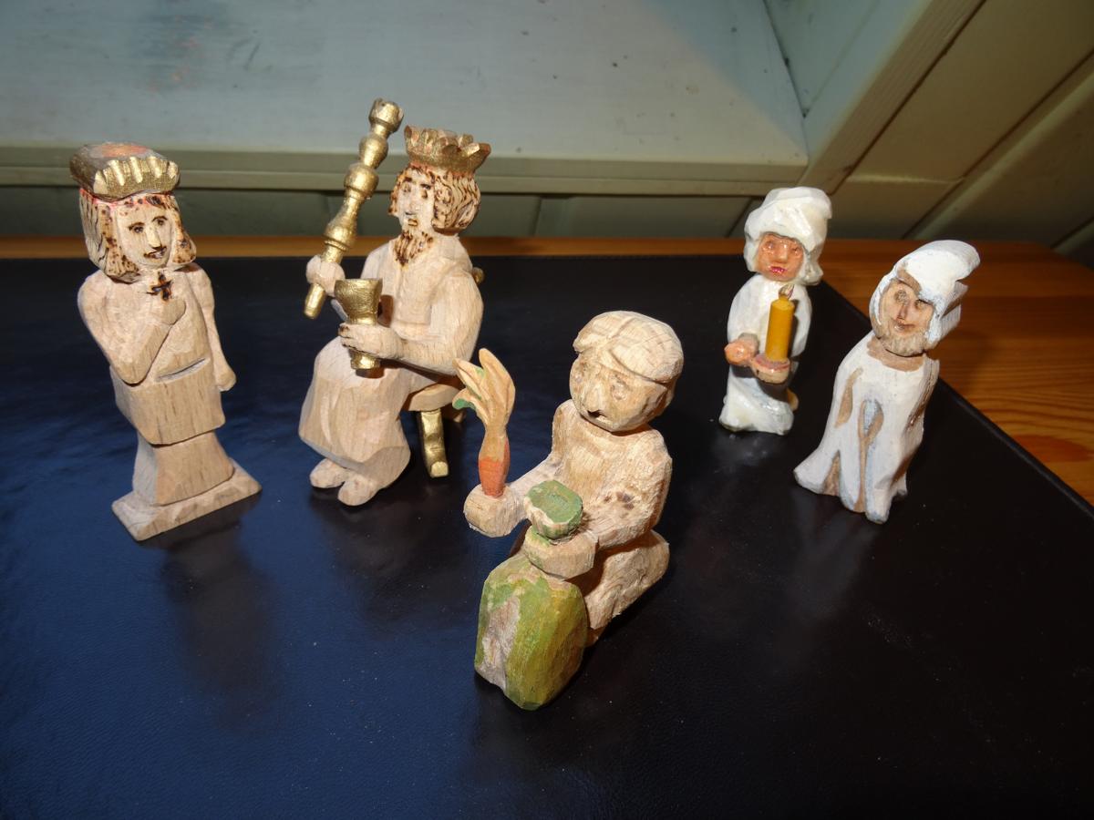 Wenn ich wieder mal mehr Zeit habe , werde ich sie mal fertigschnitzen und bemalen - es sollten mal Figuren für eine kleine Spielburg werden - der König mit Frau , ein Bauer , der gerade seinen 10 ten Teil abliefert ,