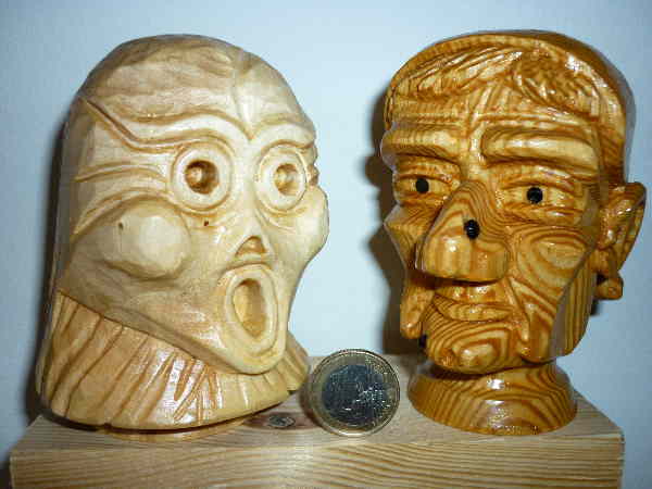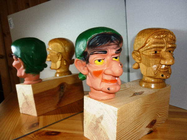 eine Hexe darf in keinem Puppentheater fehlen und dafür hatte ich auch eine Kunststoffhexe als Vorbild. Für die Hexe habe ich wie für die meisten meiner Kasperköpfe eine Zeichnung gemacht. Zuerst immer in Front und im Profi. Später auch nur noch im Profil. Der einfache Grund dafür war, Maße aus der Zeichnung nehmen zu können. Der Geist ist eine Eigenkreation, die einer Kostümfestmaske aus einem Schaufenster nachempfunden ist. Für den Geist wollte ich ein Holz das eine helle Farbe hat. Da war das Pappelholz, welches sich hervorragend schnitzen läßt, gerade richtig. Pappel wird schon lange als gutes Schnitzholz geschätzt. Die Holzschuhe und die großen Tröge für Schlachter und Bäcker wurden früher oft aus Pappelholz geschnitten. Es muß also nicht immer Linde sein, auch wenn Linde für feinere Strukturen eindeutig besser geeignet ist.