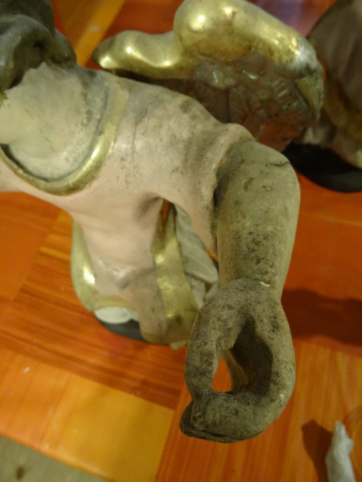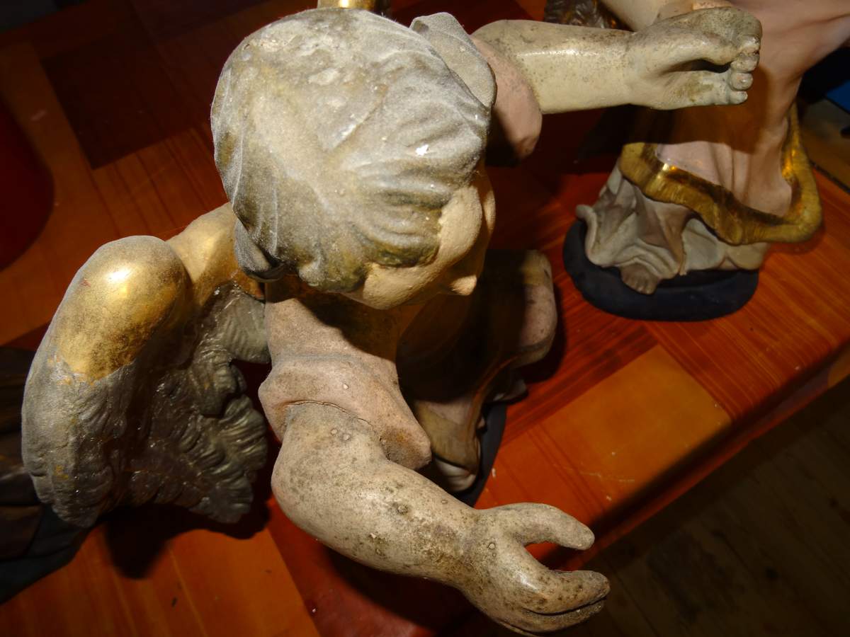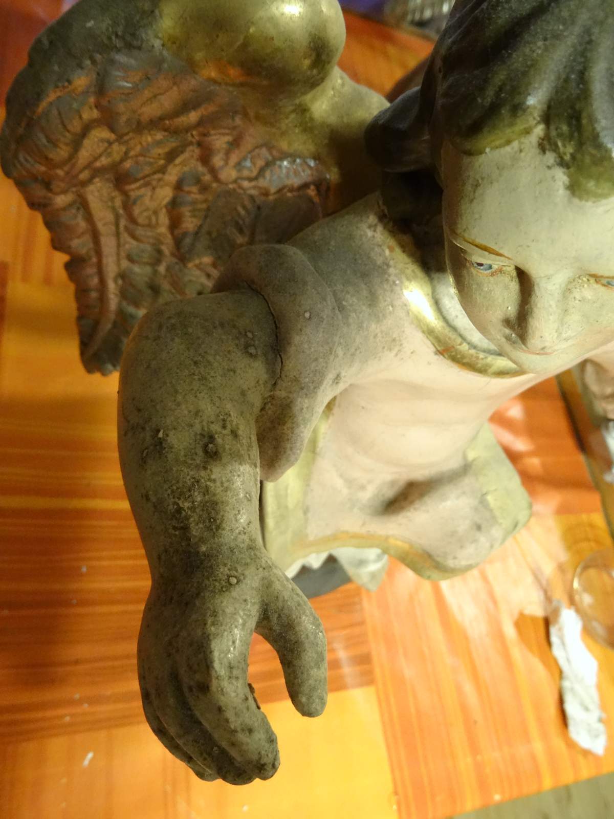 Diese 2 Engel ,hat mir der Kirchendiener gebracht , sie lagen mindestens 60 bis 100 Jahre auf dem Dachboden der alten Kirche . Der dicke Ruß hat sich schon tief in die Farbe eingefressen , verschiedene Farbschichten waren aufgeplatzt und fehlten schon . Sie waren in einem so schlechten Zustand , daß sie scheinbar als unreparabel auf den Dachboden landeten. Es war für mich einfach mal eine Herausforderung , sie wieder so herzurichten , daß sie wieder ihren Platz am Seitenaltar einnehmen können .
