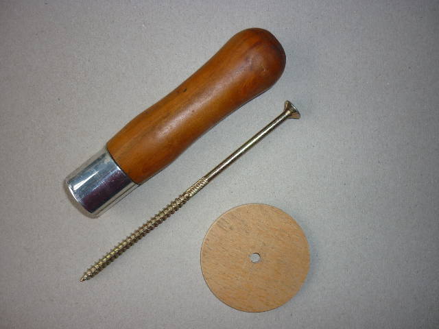 Als Nachbau-Epfehlung: Aus dem Baumarkt ein großes Feilenheft und eine sehr lange 6mm Holzschraube. Für den Sperrholzteller habe ich eine 70mm Lochsäge verwendet, aber ein 4 oder 6Kant Stück geht natürlich auch. Die Holzschraube muß nicht unbedingt so lang sein. Sie sollte aber auch im Griff verschraubt sein. Mit einem Bohrständer das Feilenheft mittig senkrecht von beiden Seiten anbohren. Die Spannbohrung zum Teller hin 0,5mm enger bohren damit die Spirale noch 15 bis 20mm in den Griff geschraubt wird. Von der Griff-Rückseite 0,5mm größer bohren als der Schraubenkopfdurchmesser. Die Bohrtiefe entsprechend der Schraubenlänge anpassen.