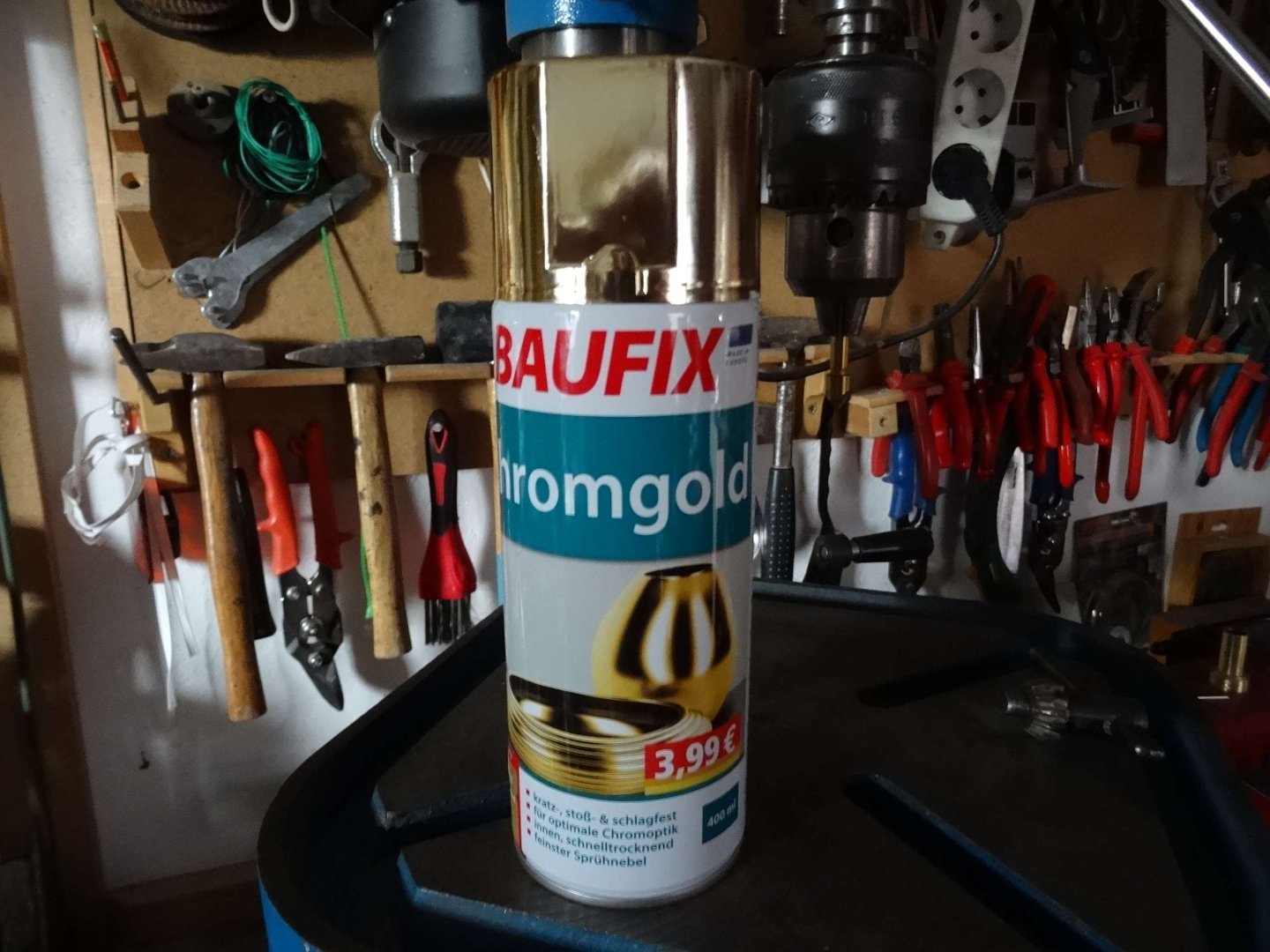 Farbe , naja - für einfache Sachen gibt es da z. B. zur Zeit ein Chromgoldspray , das sieht täuschend echt aus und ist hochglänzend ( siehe Bild , von Norma ) alles andere an Farbe ist stumpf und voll daneben und hat einfach keinen richtigen Goldton .