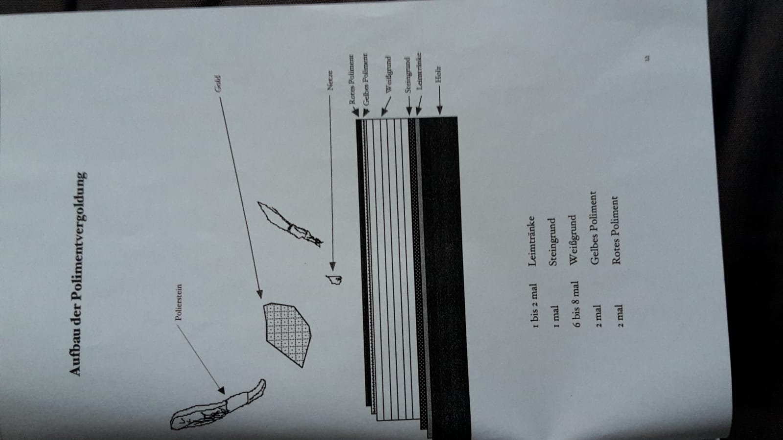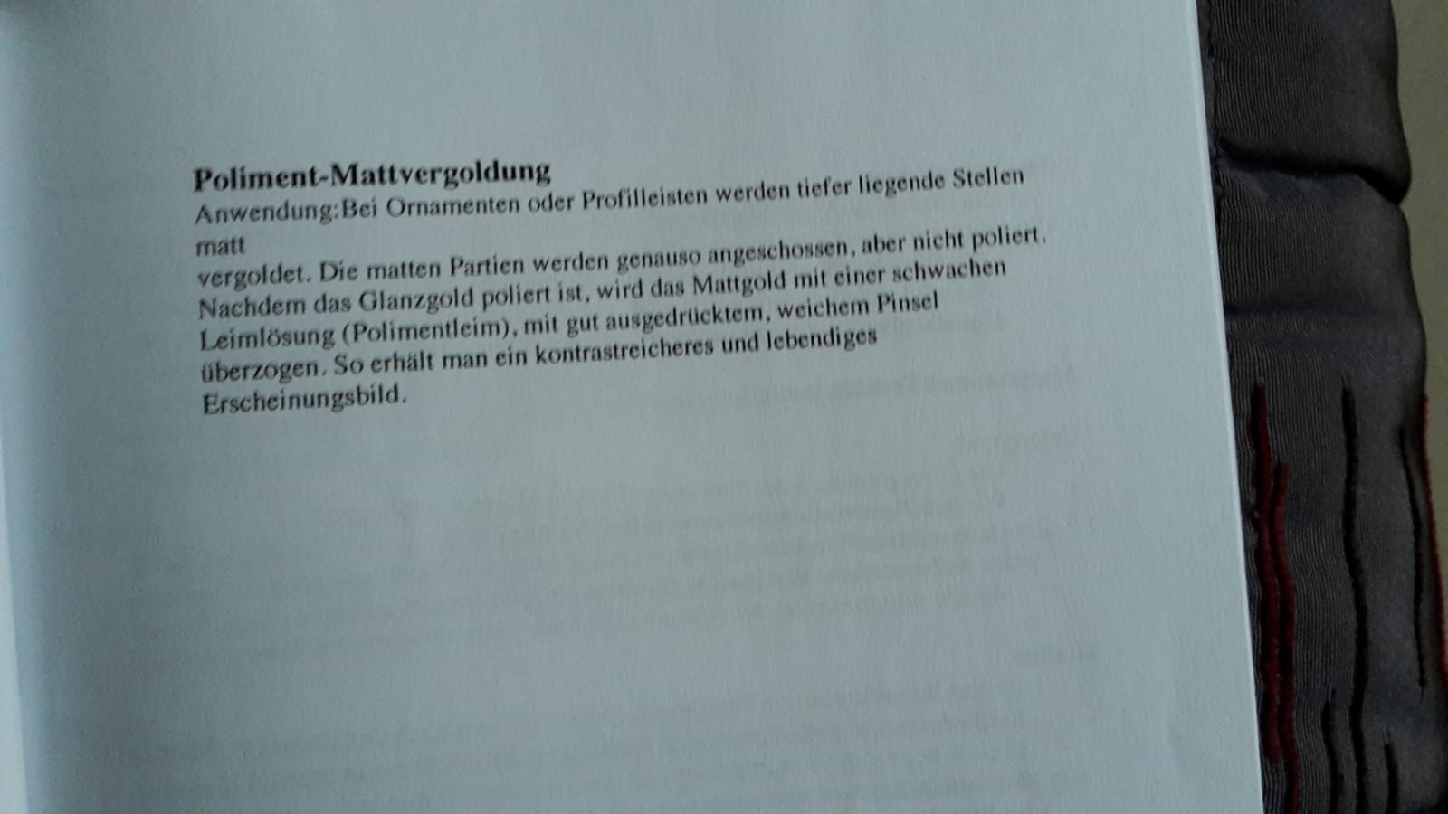 Echtgold , ist natürlich sehr teuer , man sollte es auf Kreidegrund aufbauen / kleben und es dann mit einem Achatstein hochpolieren ; eine aufwendige Sache und sehr teuer . Natürlich hält das im Innenbereich locker