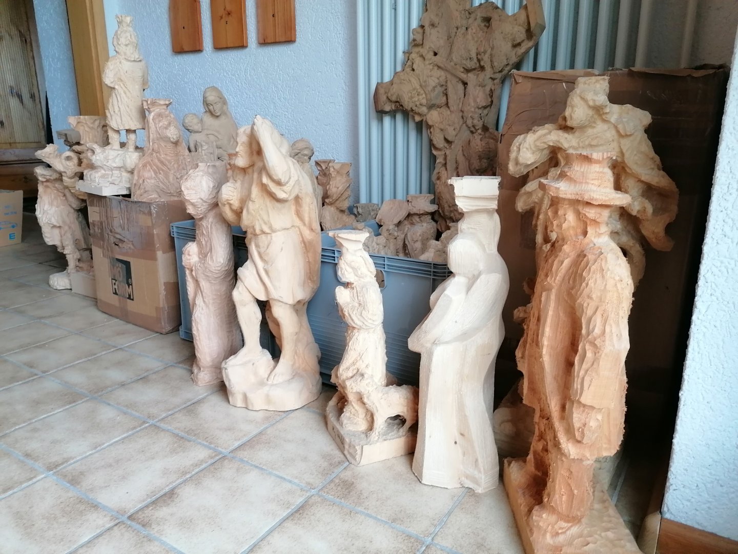 Ich konnte nicht wieder stehen. Im Nachbarort hat ein Schnitzer ( er schnitzt jetzt nur noch fastnacht Masken) sich von all seinen Rohlingen getrennt. Mittwoch hohle ich die restlichen mit dem Anhänger. Es sind weit über 100 Teile. Reliefs kommen auch noch hinzu. Ich habe für die Rohlinge, ich kann es noch gar nicht glauben, nur 100€ bezahlt. Sogar welche aus Weymouth Kiefer sind mit dabei.