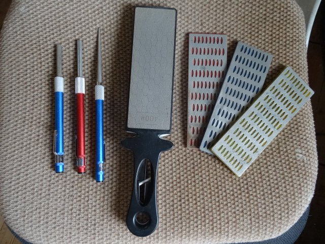 Ich habe bereits so ein Schärfsystem , benötige es aber sehr selten , da ich nur mal einen Grundschliff damit mache und ansonsten mit verschiedenen Diamantstaubplatten die Messer immer wieder " abziehe " ( siehe das Bild )