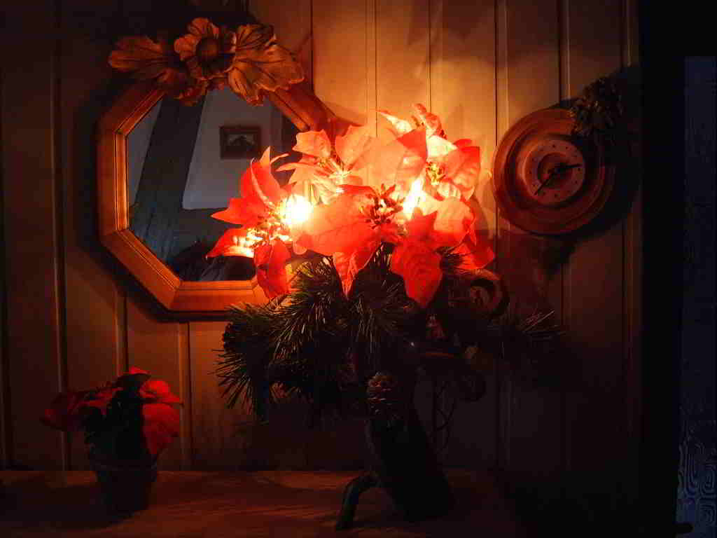 Im Sommer eine Blume aus dem Garten , im Spätsommer dann ein Strauß Edelweiß und in der Adventszeit das beleuchtete Kunstgesteck.