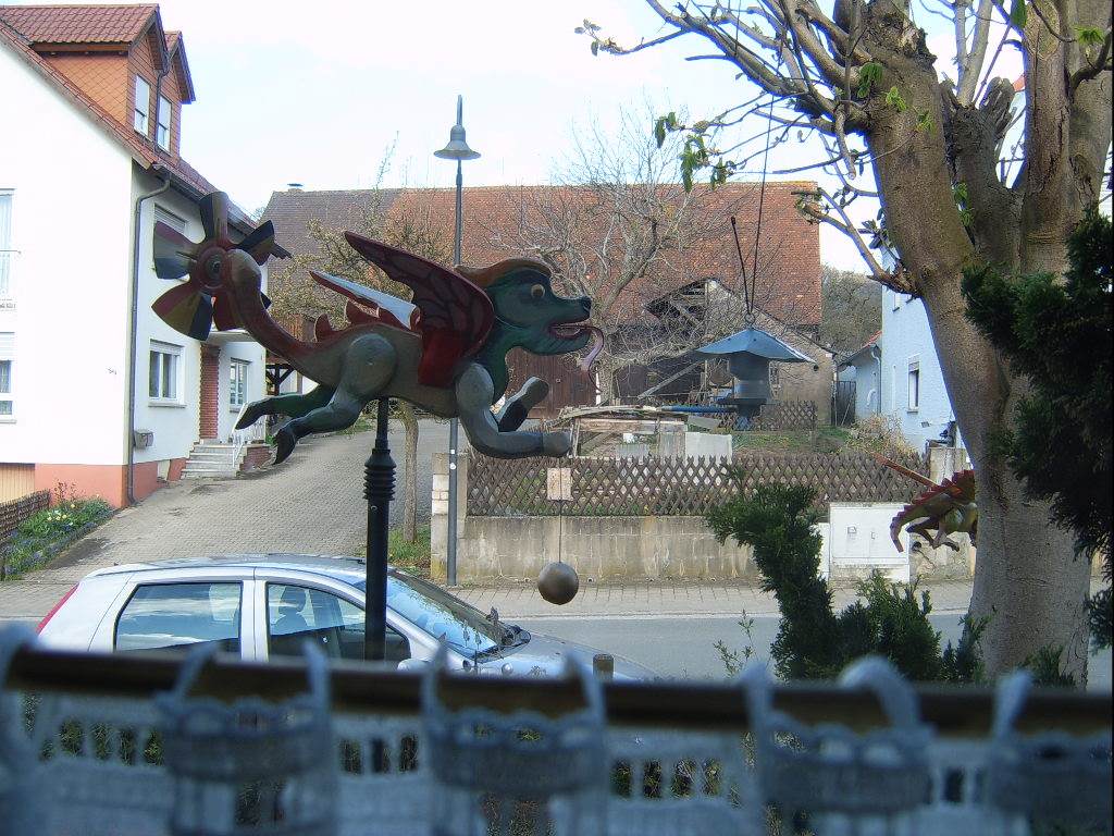 der Drachen bewegt sich im Wind nach links und rechts , der Stab , an dem das Windrad hängt , dreht sich in seiner Pfote um die Achse und das Windrad sowieso ; ein ständiges hin und her und trotzdem fressen die Meisen gleich nebenan ungestört.