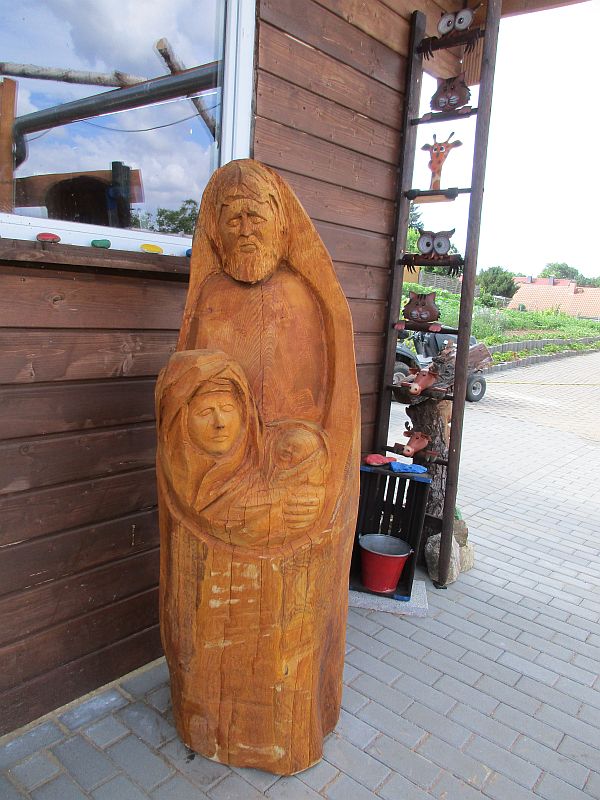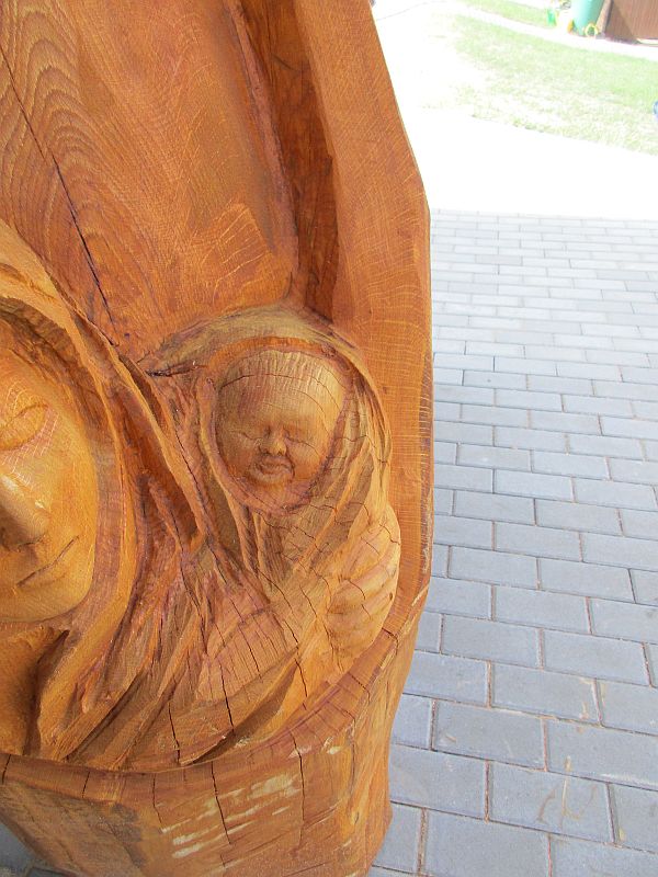 Bevor wir angefangen haben zu sägen, haben wir lange über die Gestaltung der Familie gesprochen, ich hatte eigentlich an eine Gruppe gedacht wie er sie vor der Kirche in Wiehe stehen hat. Für mich war es erst einmal etwas befremdlich. Nun stand die Gestaltung an, das wesentliche war die Familie, die Geschichte die dahinter stand, die Geburt Jesu und am Ende wie dieses Kind die Schuld der Welt zu tragen hat. Ich/wir haben die Familie im Verhältnis recht klein gestaltet, das umliegende könnte als die Last der Welt, aber auch als Schutz verstanden werden. Soviel zu unseren Gedanken.
