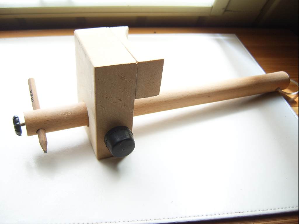 Ebenso diesen " Strichzieher " einmal für gerade Bretter und wenn ich ihn umstecke , funktioniert er speziell für runde Bretter , z. B. " Schützenscheiben " - für die Randbemalung , etc .