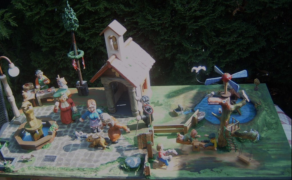 Der Dorfplatz ist mechanisch angetrieben u. auch beleuchtet , so bewegen sich der Hund ,die Hühner ,