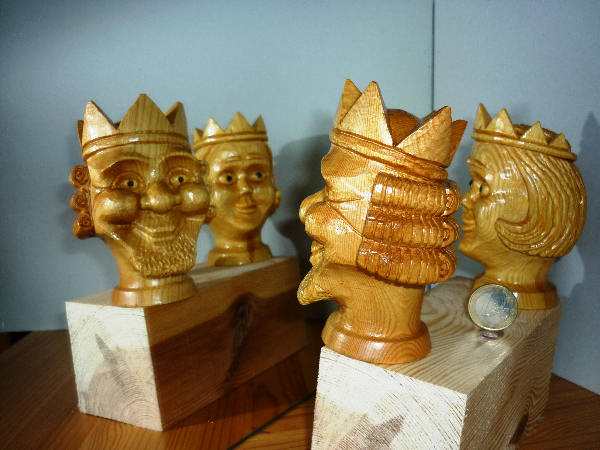 Königin und König dürfen in einem vollständigen Schauspiel-Ensemble natürlich nicht fehlen. Also habe ich auch diese beiden Puppenköpfe aus Kiefernholz geschnitzt. Nur die Königinnen-Krone fand ich unpassend. Kein Problem, so viel künstlerische Freiheit muß man sich schon nehmen um das anders zu machen. Außerdem fing ich an, mit der Lage der Holzmaserung in den Puppengesichtern zuspielen. Beim König ganz frontal, bei der Königin leicht verdreht. Ich wollte einfach ausprobieren wie das wirkt.