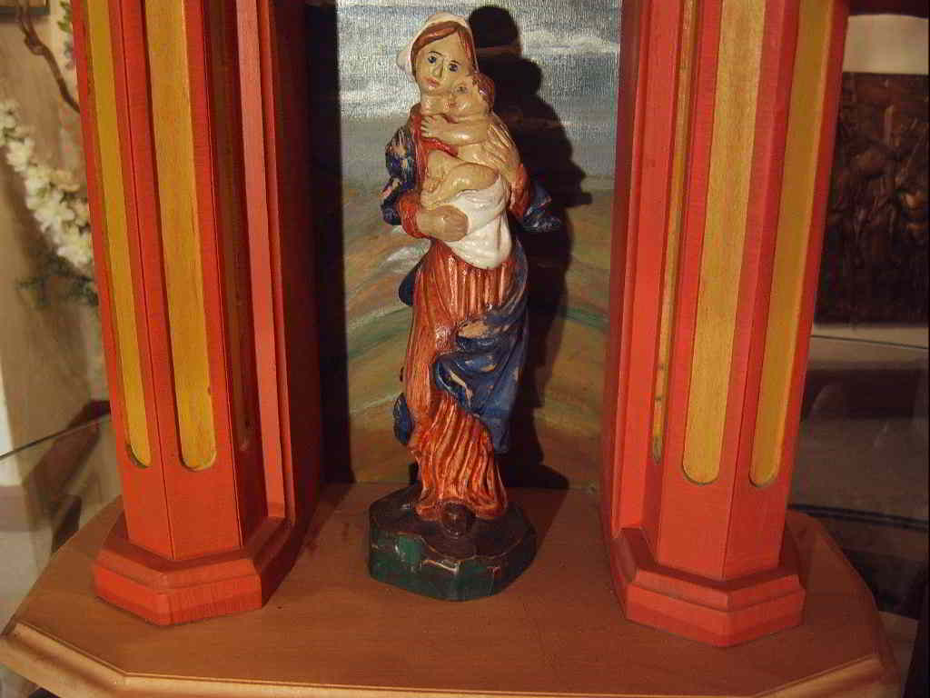 Er ist nur grundiert - alles was gelb vorgestrichen ist, muß noch vergoldet werden. Die Maria ist in der Farbe etwas zu kräftig, man sieht , daß ich auch danach versucht habe , die Farbe etwas durchzureiben ; ich habe sie nach einer