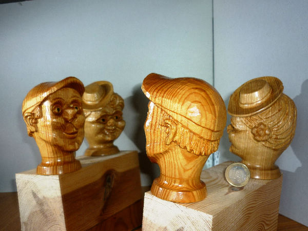 Beide Köpfe sind wieder aus Kiefernholz, aber diesmal habe ich die Faserrichtung der Trude bewußt ca 90Grad verdreht. Ich wollte einfach mal sehen wie das wirkt. Auf Trudes einem Bäckchen ist dabei ein runder Jahresring des Holzes erschienen.