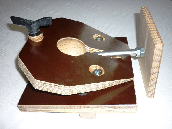 die Buchenholz-Kugel aus einem Bastlermarkt hat 7cm Durchmesser und war kleiner durchgebohrt. Die Platten sind aus wasserfestem Schichtholz. Einschlag-Gewindehülsen, ein Stück M10 als zentrale Gewindestange über die ein Rohrstück geschoben ist. Die Anpressschraube M8 mit 4kant und Flachkopf ... alles Baumarkt. Eine Stahlfeder die die Platten auseinanderdrückt ist nicht abgebildet aber nötig um auf der Kugel besser verstellen zu können. Mit dem Schmirgelleinen auf der Kugel habe ich die mit dem Hohleise vorgeschnittene Rundung in dem Loch der Oberplatte auf den genauen Kugelradius nachgeschliffen. Aus dem Reststreifen von der Schrägung der Oberplatte ist die Schiefwinklige Schichtholz-Unterlegscheibe der Andruckschraube geschnitten (wichtig). Melde Dich wenn Du weitere Fragen hast.