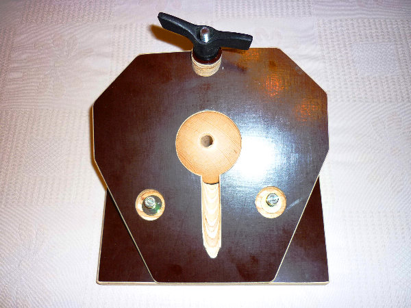 Die Oberplatte muß abgeschrägt werden, von 4mm Vorderkante Dicke, 50mm tief bis zum Durchbruch ander Plattenoberseite. Dieser Schnitt muß gleichmäßig sein, weil der Schräge Abschnitt für 2 schräge Unterlegscheiben (Lochsäge), oben und unten für die Spannschraube benötigt wird.