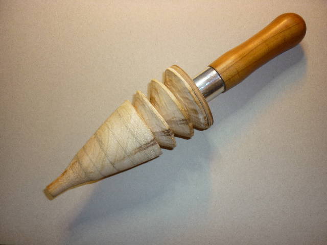 Eure Baum-Schnitz-Beispiele haben mein besonderes Interesse geweckt. Nun ist es ja auch kurz vor Weihnachten, und da sind ja Fichten groß gefragt. Ich habe lange nichts mehr geschnitzt, aber an einer Fichte wollte ich mich mal wieder versuchen. Das Material ist ein Ast der Weide, und die Rohform habe ich aus Bequemlichkeit gedrechselt. Der von mir schon vorgestellte Schnitzgriff lieferte die handliche und sichere Vorrichtung für dieses Projekt.
