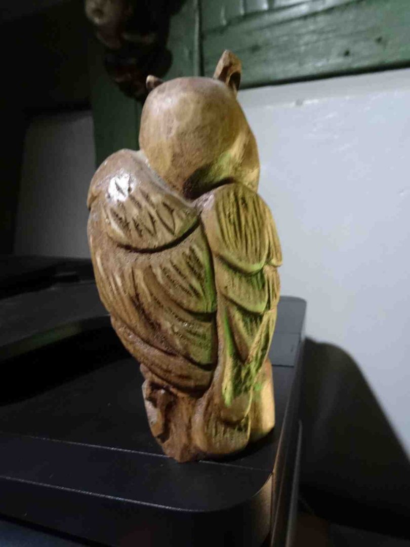 vor längerer Zeit habe ich auch mal so einen " Nachtvogel " geschnitzt ; die Augen leuchten , weil ich da in ein wenig Klarlack ein fluoreszierendes Pulver mit eingemischt habe ... aber der grundsätzliche Fehler ist : die Kralle / Fuß