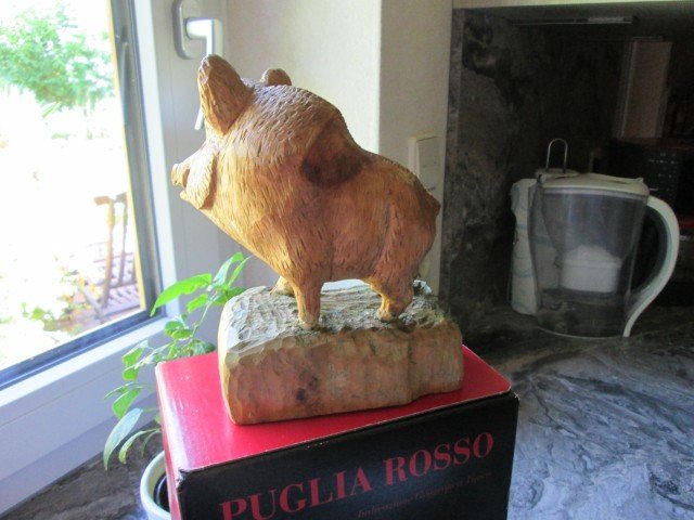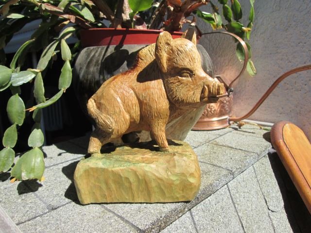 Das ganze Wildschweinchen etwas dunkler machen ( mit Ölfarbe , da die länger " offen " bleibt und dann mit einem Holzzahnstocher kurze , kräftige Borsten herausreiben / kratzen , die dann den Untergrund wieder erscheinen lassen ; es sieht dann aus - durch das die " Kratzer " dann wieder hell werden , wie die Original - Wildsau und die Hauer / Zähne dann auch etwas hell abreiben .