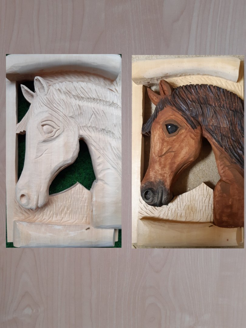 Hallo Schnitzfreunde, nun habe ich den Pferdekopf bemalt. Ich hatte mir es schöner zu bemalen vornenommen. Aber das Bemalen ist nicht meine Stärke. Bin immer so ungeduldig. Erst wollte ich Ölfarbe nehmen, aus meinen Grundfarben habe ich das gewünschte Braun nicht gemischt bekommen