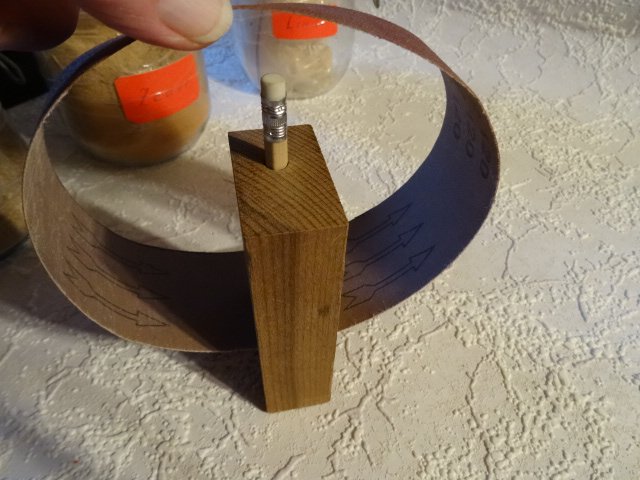 So habe ich z. B. zwei Schleifmaschinen - siehe Bild - dafür kaufe ich billig die breiten Bänder und schneide sie schmal . Hierfür ist das Anreißholz mit dem eingebauten Bleistift gedacht , so schneide ich mir " am Strich entlang "