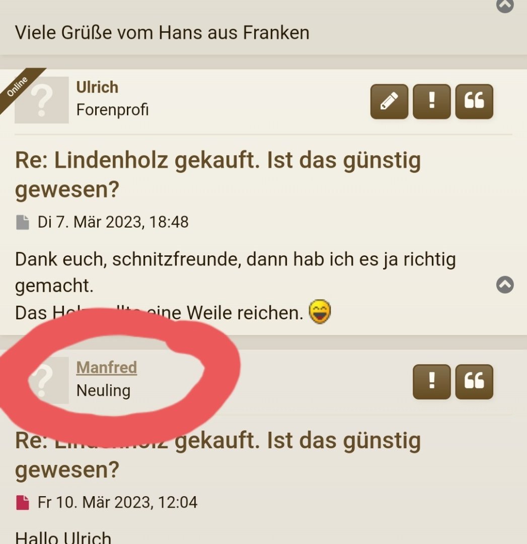 es geht jetzt nicht um das Lindenholz, sondern um meine Antwort auf Deine Bitte, die "Ente" nachschnitzen zu dürfen. Warum antworte ich Dir hier: ich habe auf der Seite alles nachgesehen, kann aber nicht erkennen, wo ich Dir auf Deine Frage bezüglich des Nachschnitzens antworten soll. Vielleicht bin ich auch nur ein bischen blöde ...