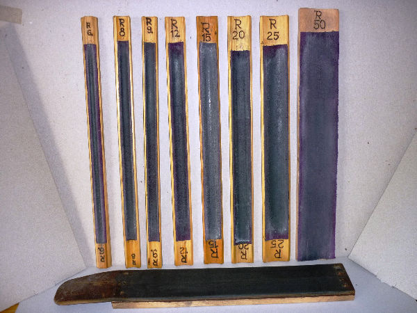 nachschärfen heißt für mich nur noch Abziehen mit TORMEK-Polierpaste auf Leder beklebten Leisten. Die verschiedenen Holleisten-Radien sind am Leistenende eingebrannt. Die Leisten sind ca 30cm lang.