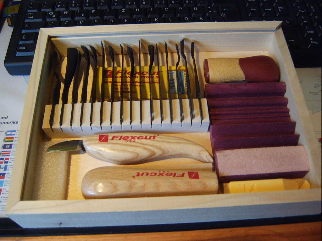 den Satz von Flexcut habe ich erhalten - Klasse - sehr scharf , mit den Griffen muß ich mir demnächst noch eine Patentlösung einfallen lassen ; es geht zu schwer zum Wechseln.