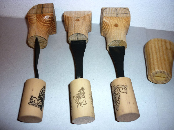 diesen Satz habe ich als 3.Satz gekauft. Ja die Griffe lassen sich anfangs schwer auf-und abstecken, aber das ist alles Kunststoff! Das bleibt nicht lange so. Ich (gelernter Werkzeugmacher) hatte erst überlegt einen Stahlkern als Wechsellager in einen oder zwei Holzgriffe zu bauen. Wenn ich "Wanderschnitzer" im Wohnmobil wäre hätte ich das auch realisiert. Aber eigentlich braucht man ja meist 5 oder mehr Schnitzeisen fast gleichzeitig. Also meine Entscheidung, jede Klinge hat einen Griff verdient. Wenn man gleich eine Serie auflegt geht das auch recht schnell. Das erste Loch für den Dübel aus Bambus-Blumenstab wird, wenn die Klinge in den noch eckigen Unterklotz eingepasst ist, gebohrt. Der Blumenstab hat den gleichen Durchmesser wie das Loch in den Eisen.Dann wird die dünne Oberplatte mit der Klinge und den dicken Unterklotz verleimt, umgedreht und zurückgebohrt und verdübelt.