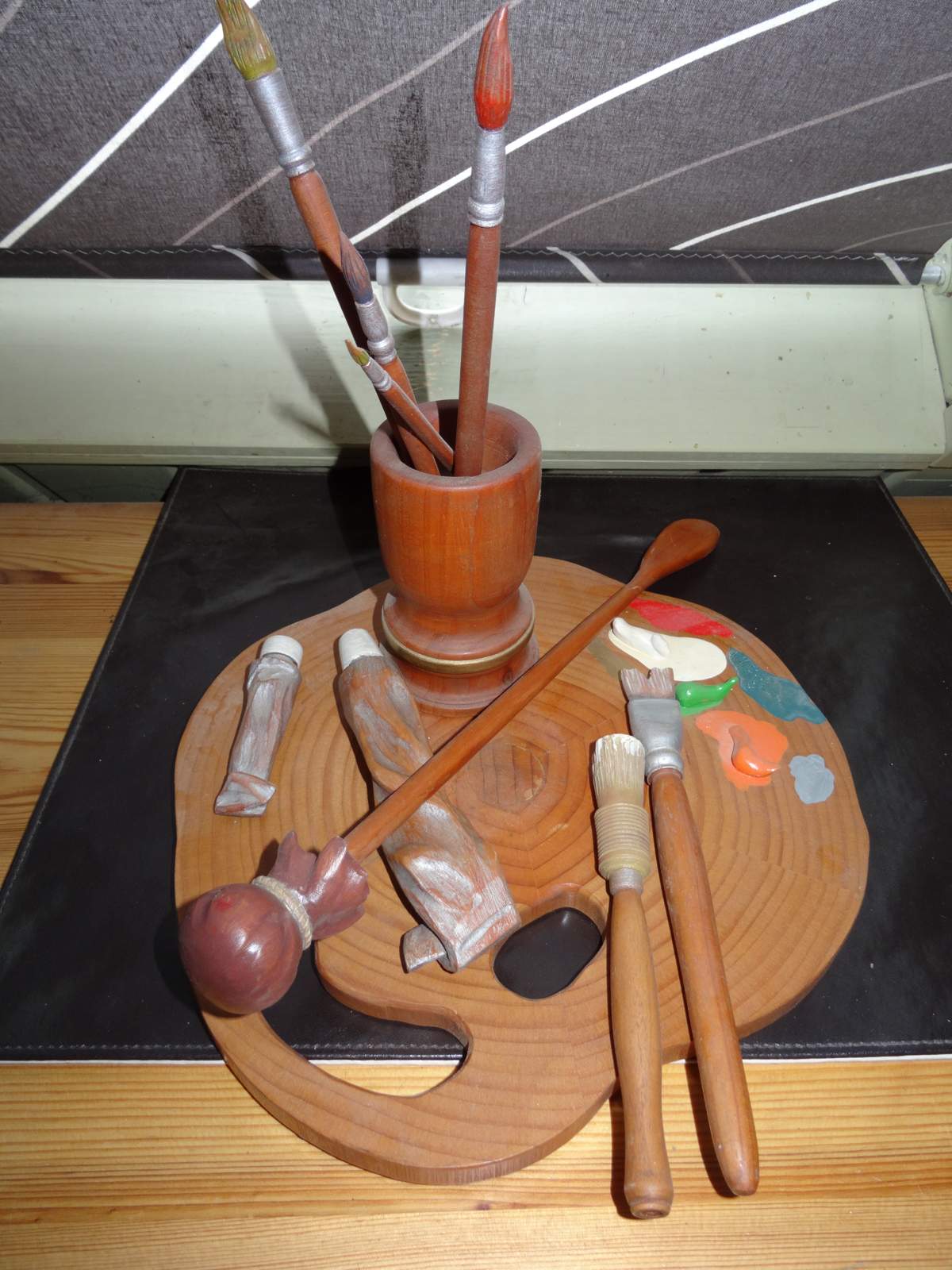 hier siehst du mal so einen Malhilfsstock , allerdings alles zusammen als Schnitzwerk . So einen Stock kann man jederzeit selbst herstellen und ist immer eine kleine Hilfe bei feiner Bemalung .