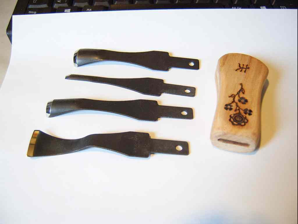 - In der großen Packung werden der Wechsel-Kunststoff-Griff und ein langer Wechsel-Holzgriff ähnlich den klassischen Griffen von Schnitzbeiteln mitgeliefert.