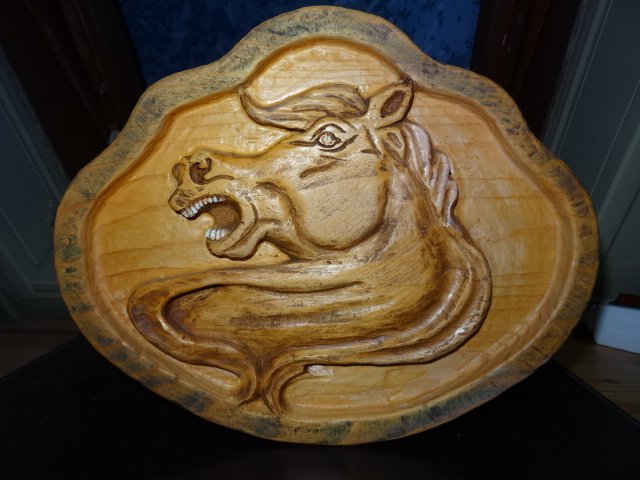 Hallo Schnitzfreunde, ich komme gerade aus dem Keller, die Farbe ist noch nicht trocken. Ich hoffe die blaue Farbe ( soll den Himmel über Mecklenburg darstellen) :lol: passt besser als der blaue Rand vom Karpfenteller. Farbliche Gestaltung ist eine meiner Schwächen. Gebt mir bitte Tipps was besser zum Pferd farblich passt. Der Rand ist noch unbehandelt