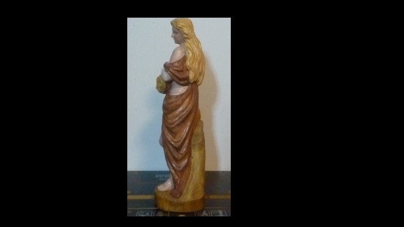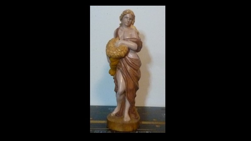 Gewand war ansehbar, den rest habe ich wieder überschnitzt . Der Körper ist mit Acryl-Mischung und Sockel und Baumstupf wieder gebeizt, Haare und Blumenstrauß nur grundiert zum abschluß die ganze figur mit Wachsöl