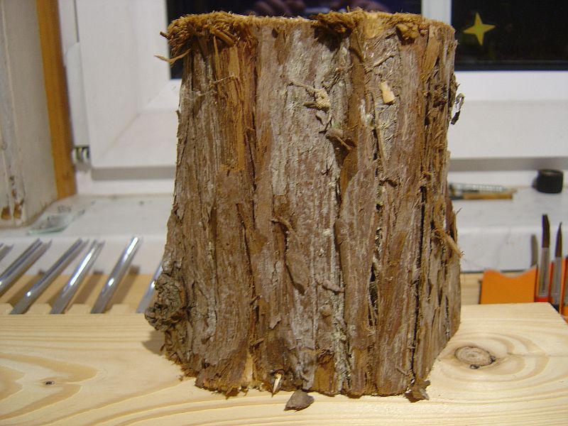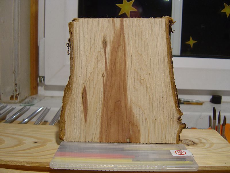 Habe seit vergangenem Jahr ein Reststück Eibe stehen B 15 H 17 Dicke von 5 bis 2 cm und gestern Abend habe ich endlich wieder die Eisen in die Hand genommen und erst einmal die Rinde abgemacht. Dann die Schraube eingedreht, eingespannt und überlegt was ich daraus machen kann. Ist eine tolle Erfahrung, ohne Vorlage einfach einmal etwas zu schnitzen, zu überlegen was könnte man aus so einem Stück Holz machen.