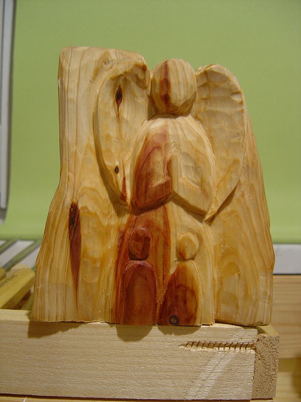 Bin nicht allein, oder Vielfalt würde ich das nennen wollen. Hatte erst an was moderneres, abstraktes gedacht dann ist es der Engel mit den zwei Menschen geworden. Die Struktur und die Holzfärbung gefallen mir am besten.