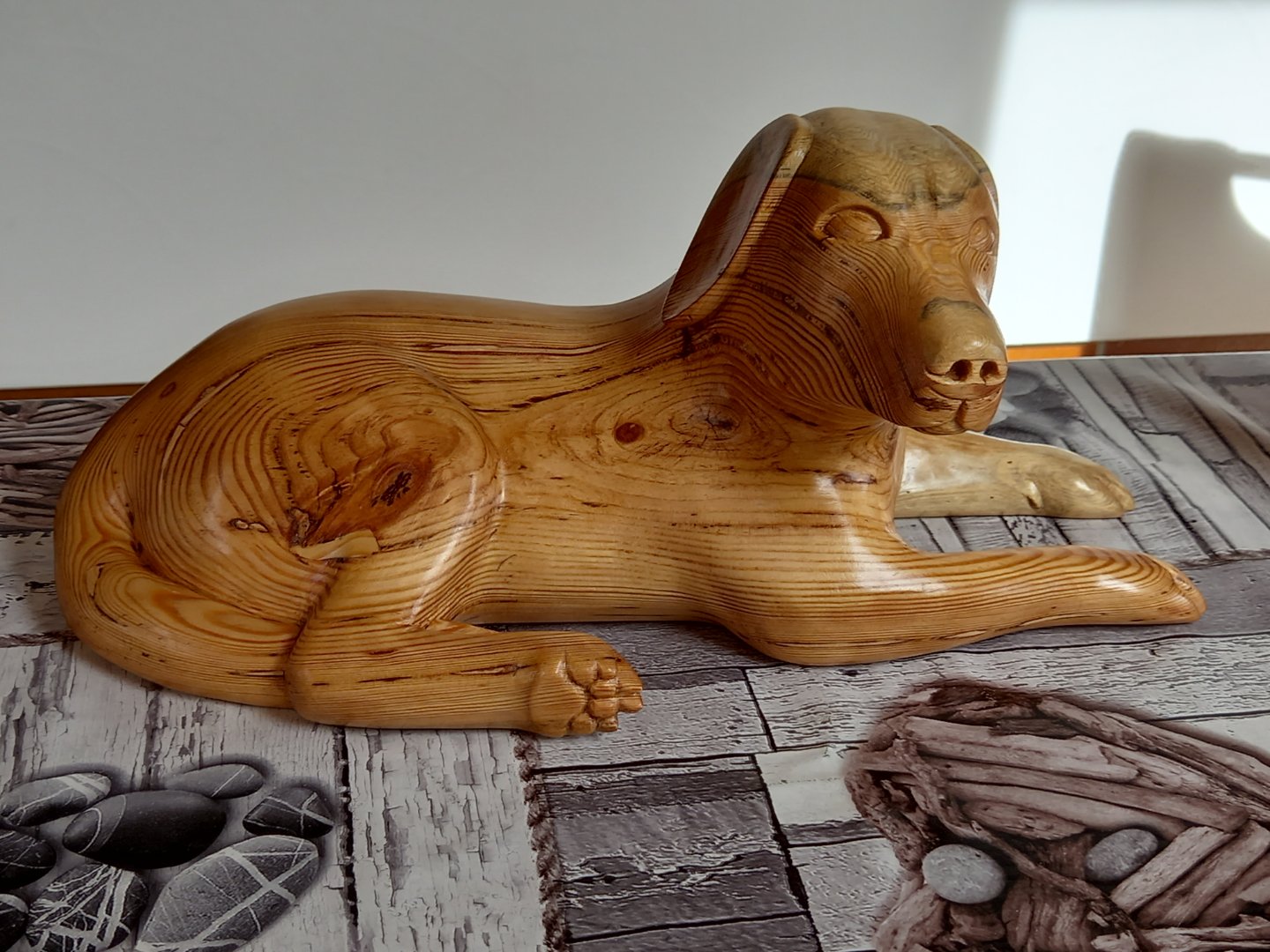Das Holz stammt von einer abgestorbenen dürren Kiefer aus meinem Garten. Wie ich den Baum auf gesägt habe , dachte ich, das ist ein sehr gutes eng gewachsenes Holz. Aber beim Schnitzen stellte sich was anderes raus. Der Splint hatte schon Blaufäule und noch viele andere Fehler. Eigentlich wollte ich den Hund so anlegen dass, das Holz mit Fäule wegfällt, leider ist mir das nicht gelungen.