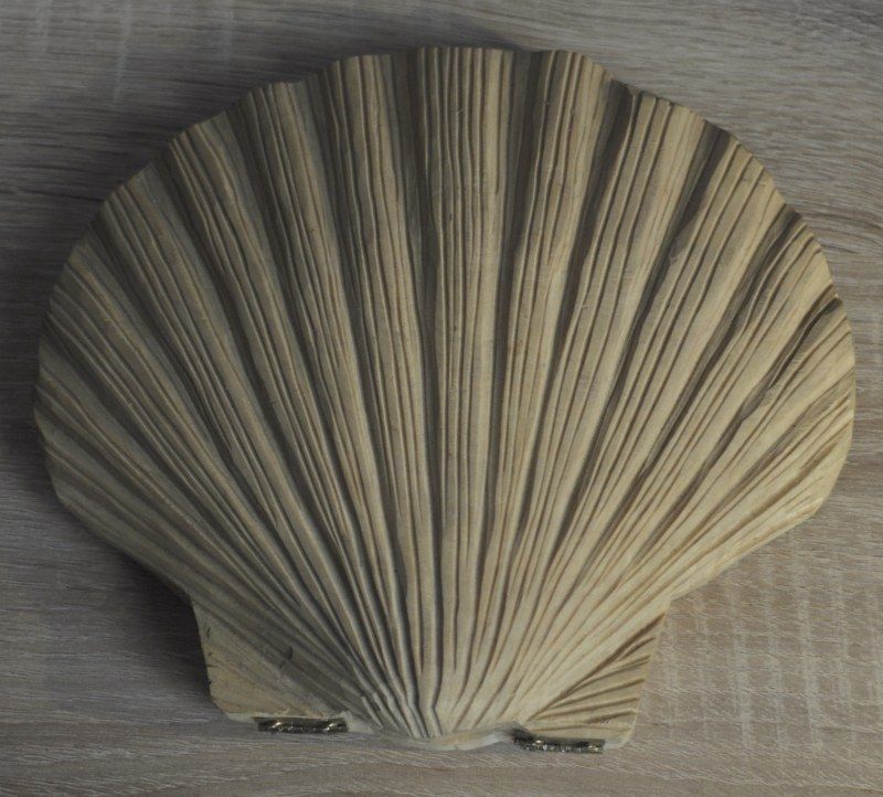 Die Muschel ist aus Linde, ca 18x20cm und hat zusammengeklappt eine Höhe von ca. 3,5cm