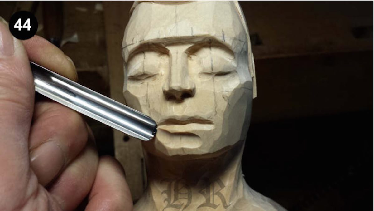 Mit einem Geißfuß 90 Grad wird nun der Mundspalt geschnitten. Hierbei wird jeweils von außen nur bis zur Mitte geschnitten. Mit einem spitzen Geißfuß 3/15 und einem schalen 3 / 10 werden die Lippen entsprechend geformt wie ich im Bild 42 zeige.
