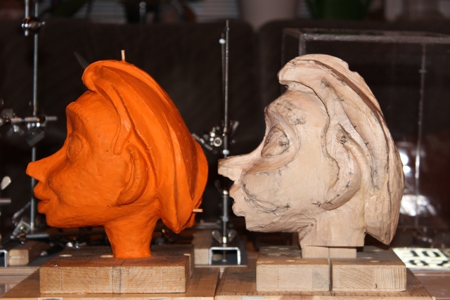 Wie in meiner Vorstellung erwähnt bin ich dabei eine Marionette zu schnitzen, es ist bis auf einige Fingerübungen für die Flöten meine erste Schnitzarbeit. Zuerst habe ich mir von Bilder aus dem Film " Die Legende von Pinocchio " eine Zeichnung skizziert und nach der ein 1:1 Modell aus Knet vom Kopf geformt.