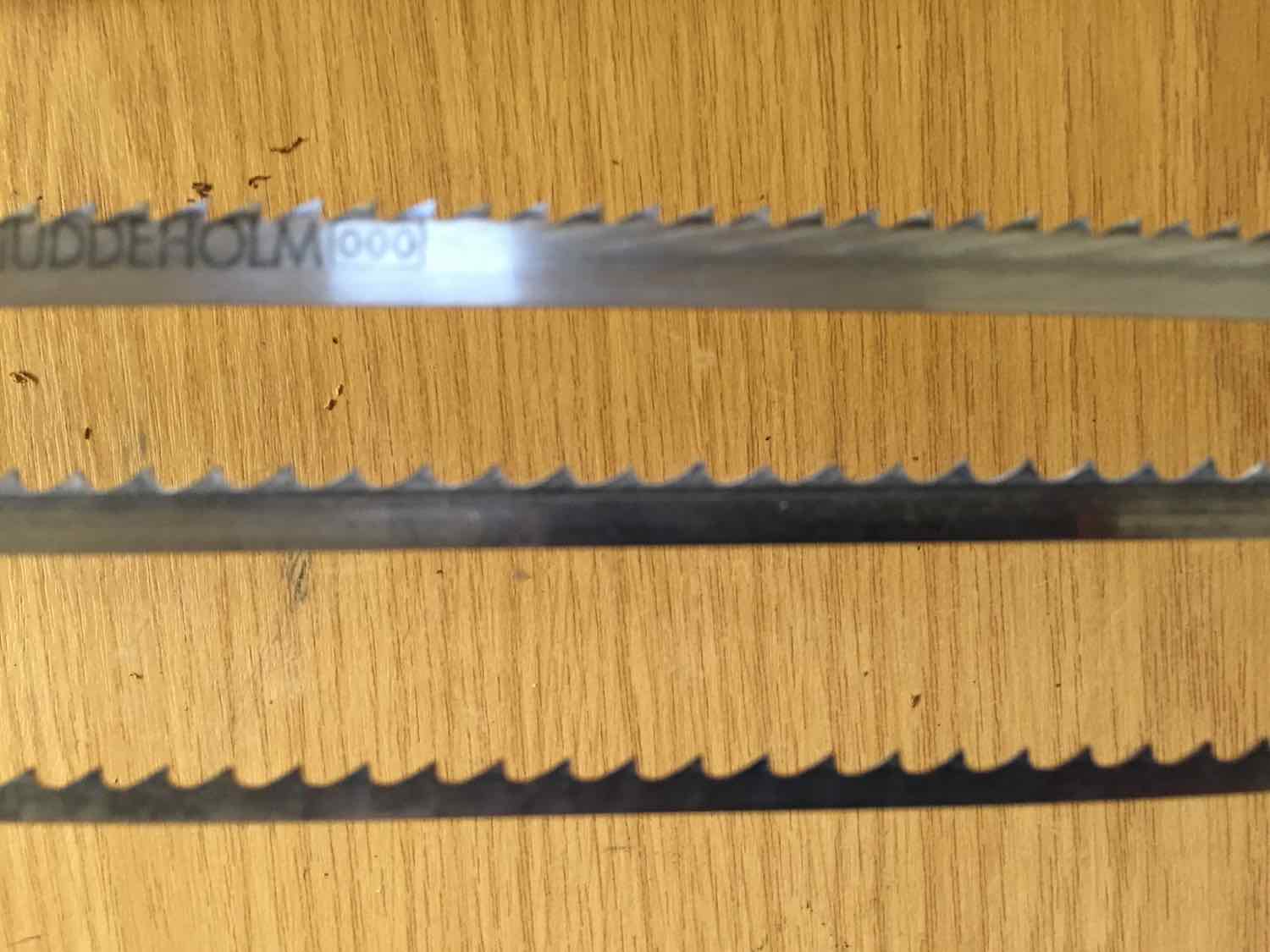 hier mal ein paar Sägebänder. Von oben 15 mm breit noch im Originalzustand. Ich hoffe es ist halbwegs zu erkennen, wie eng der Zahnabstand ist.